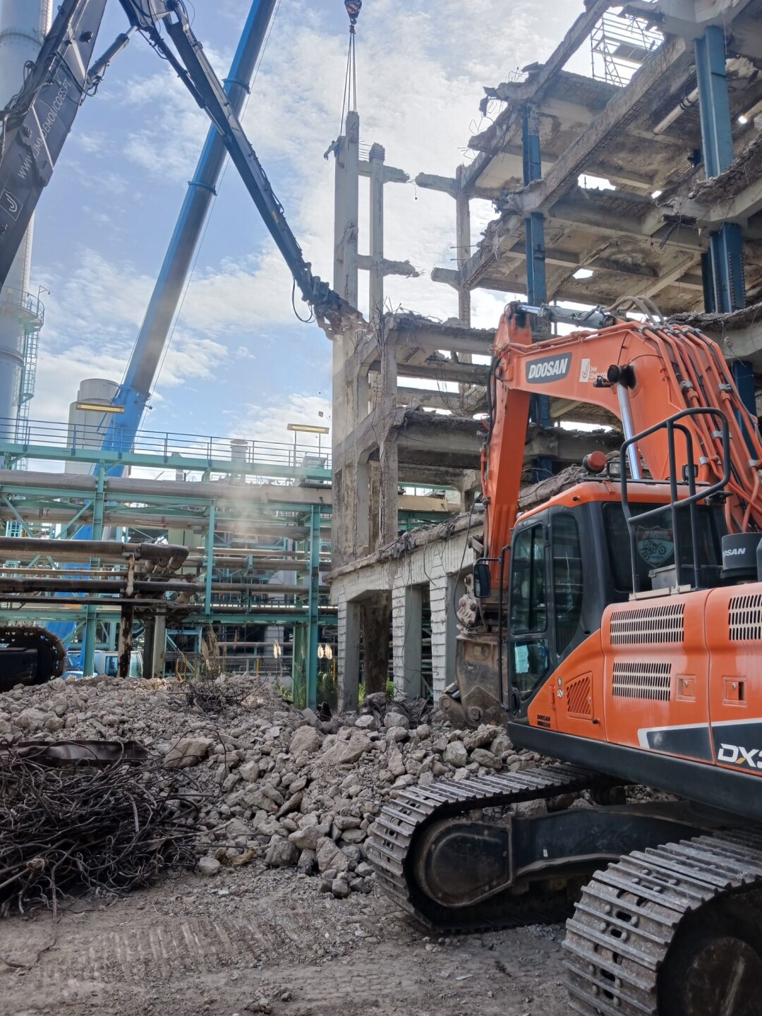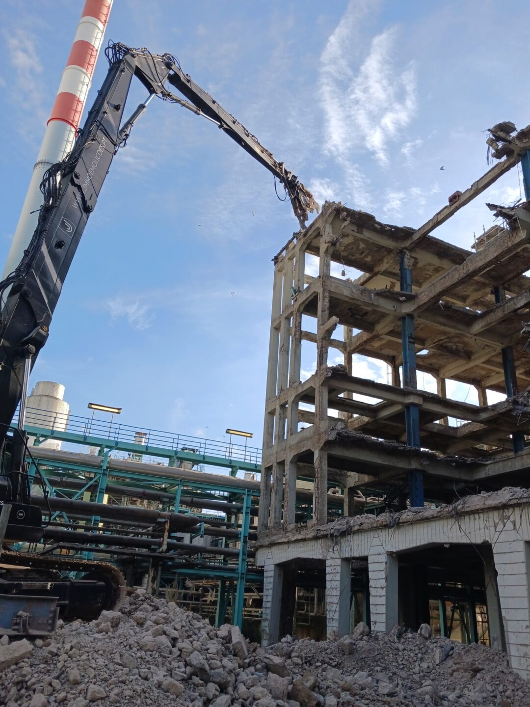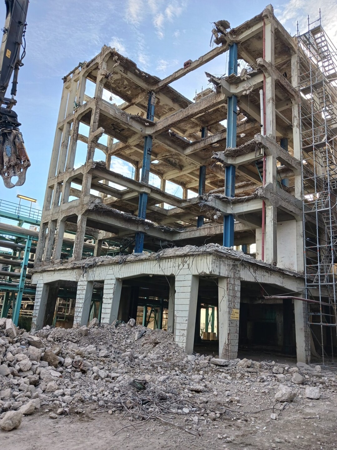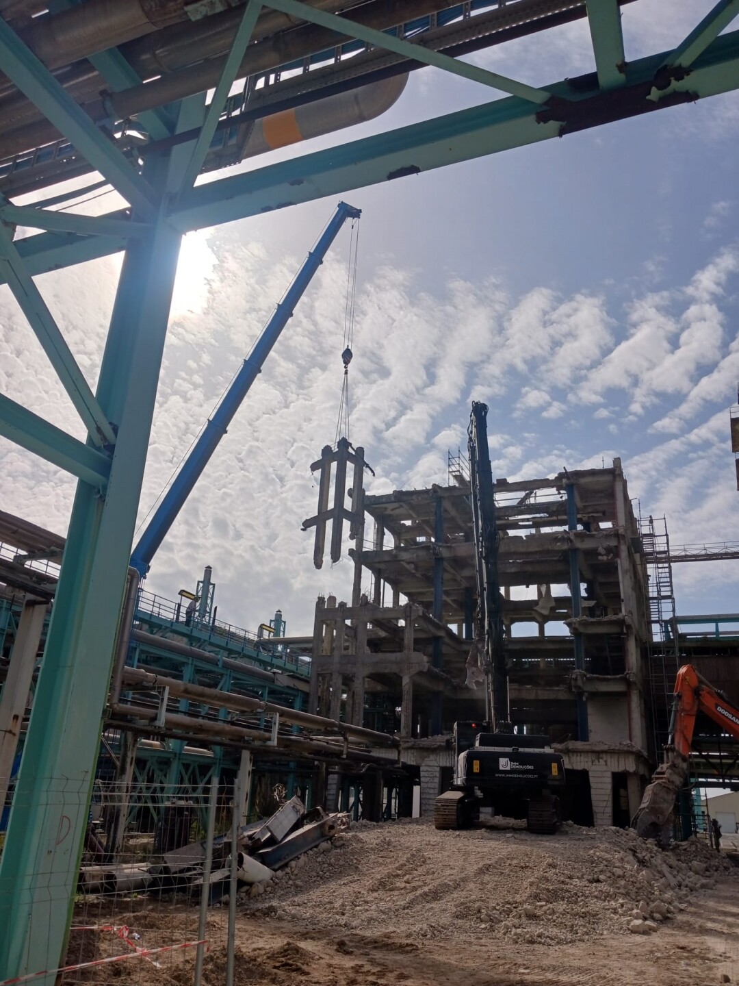 A intervenção consistiu no apoio às operações de demolição controlada de estruturas existentes, incluindo desmontagem de elementos metálicos e em betão armado, corte técnico, fragmentação e remoção de materiais. Foram igualmente assegurados os procedimentos de triagem e encaminhamento de resíduos, em conformidade com as normas ambientais aplicáveis.