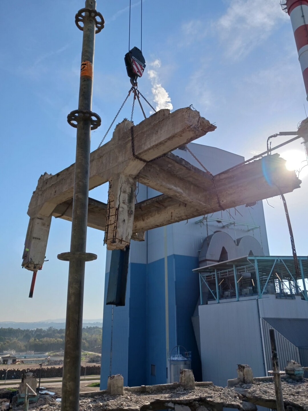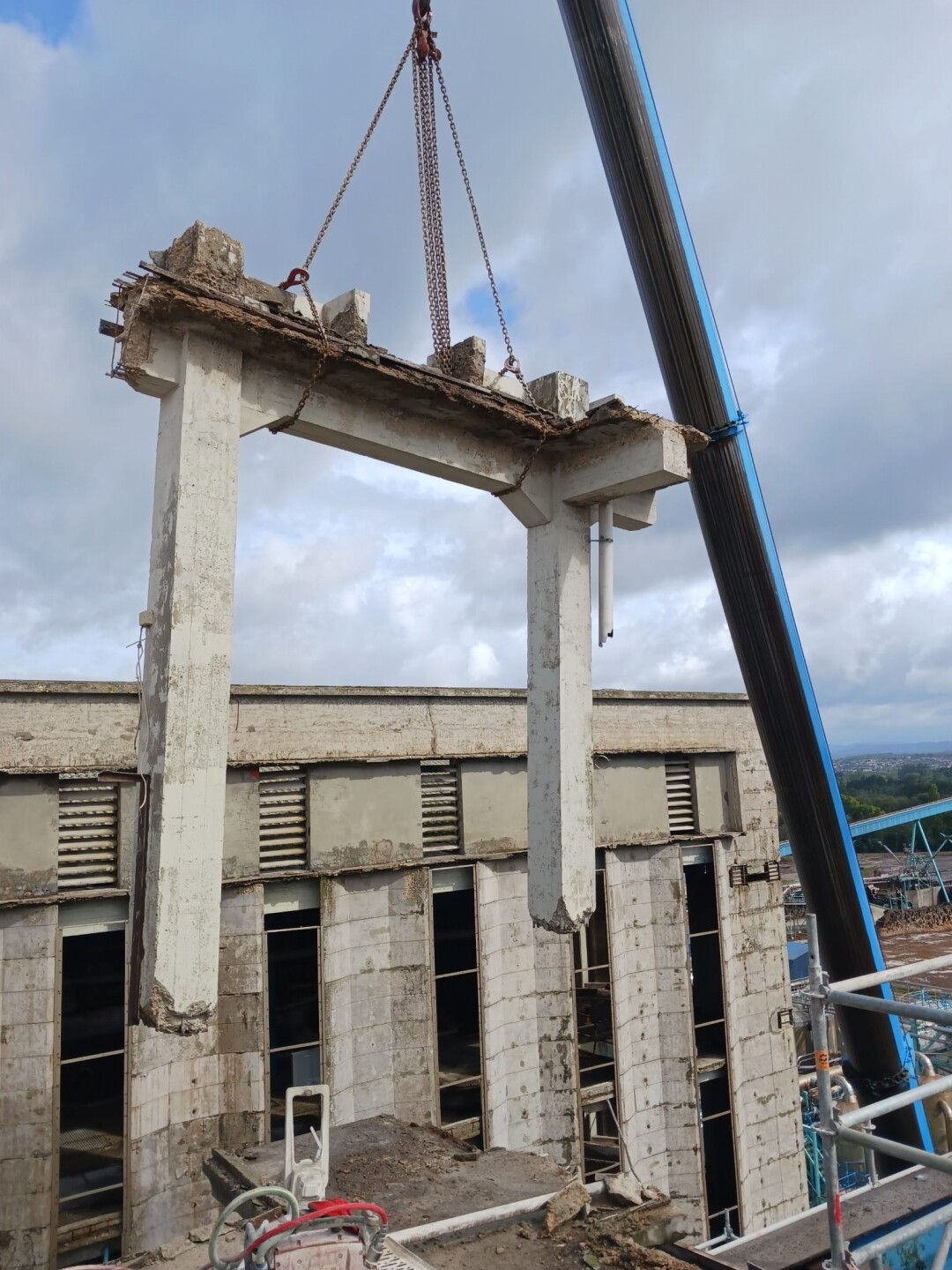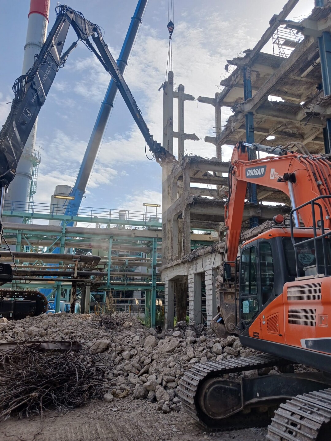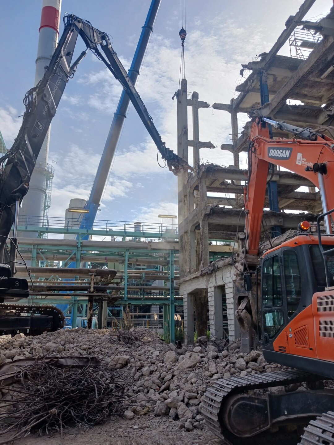 A intervenção consistiu no apoio às operações de demolição controlada de estruturas existentes, incluindo desmontagem de elementos metálicos e em betão armado, corte técnico, fragmentação e remoção de materiais. Foram igualmente assegurados os procedimentos de triagem e encaminhamento de resíduos, em conformidade com as normas ambientais aplicáveis.