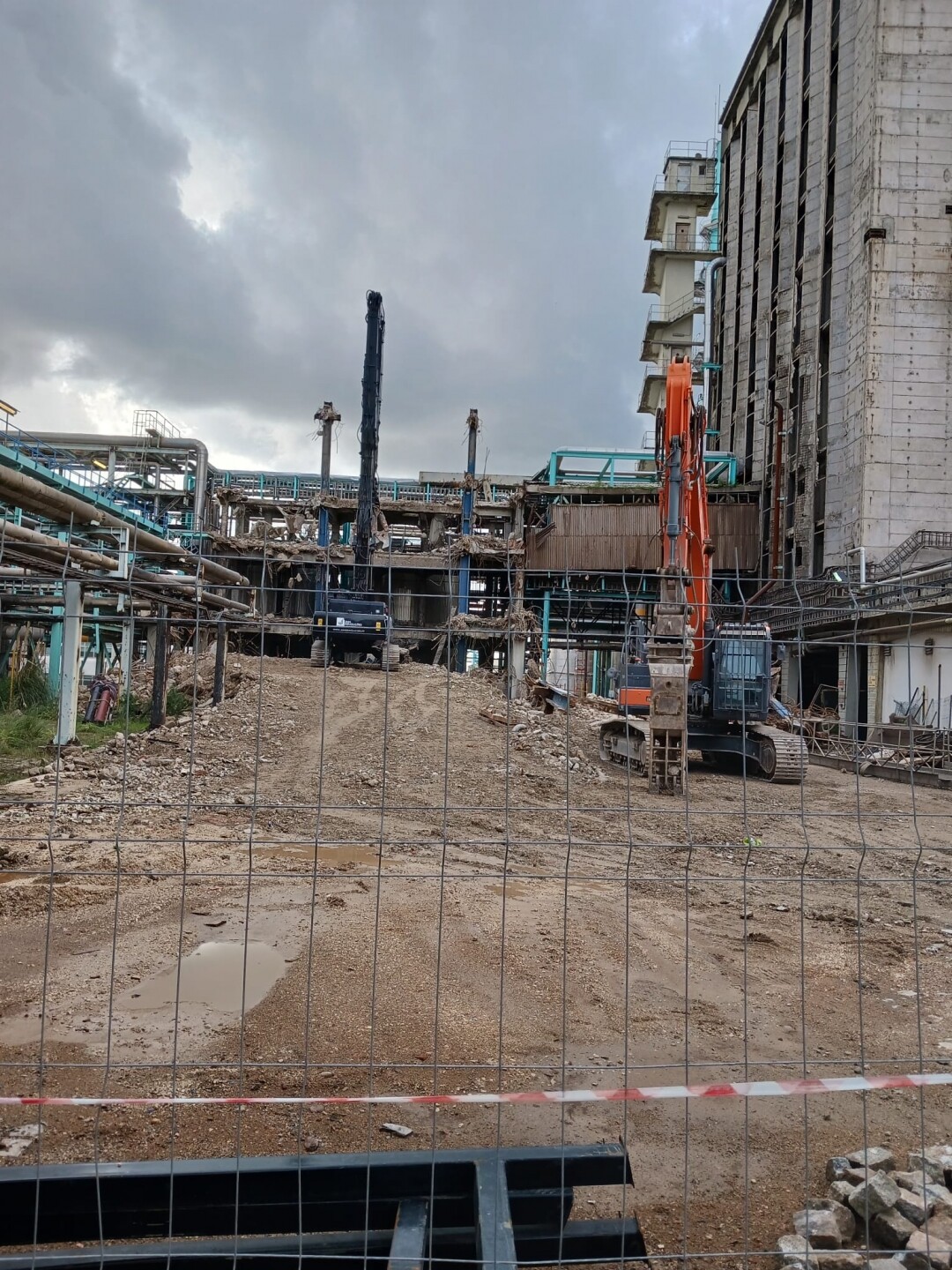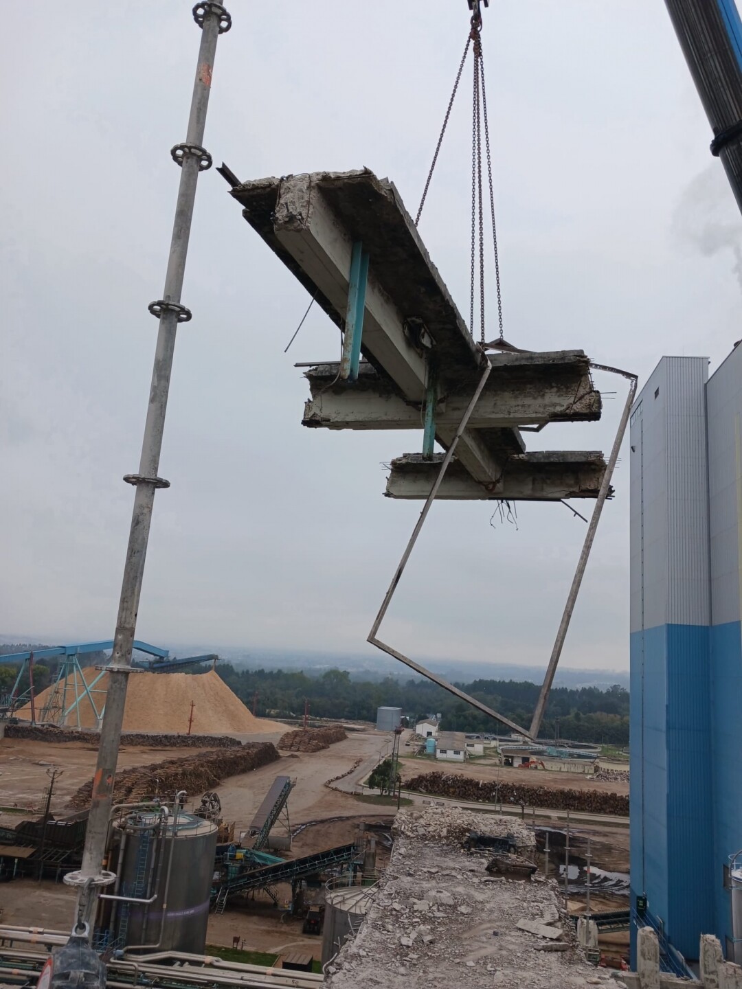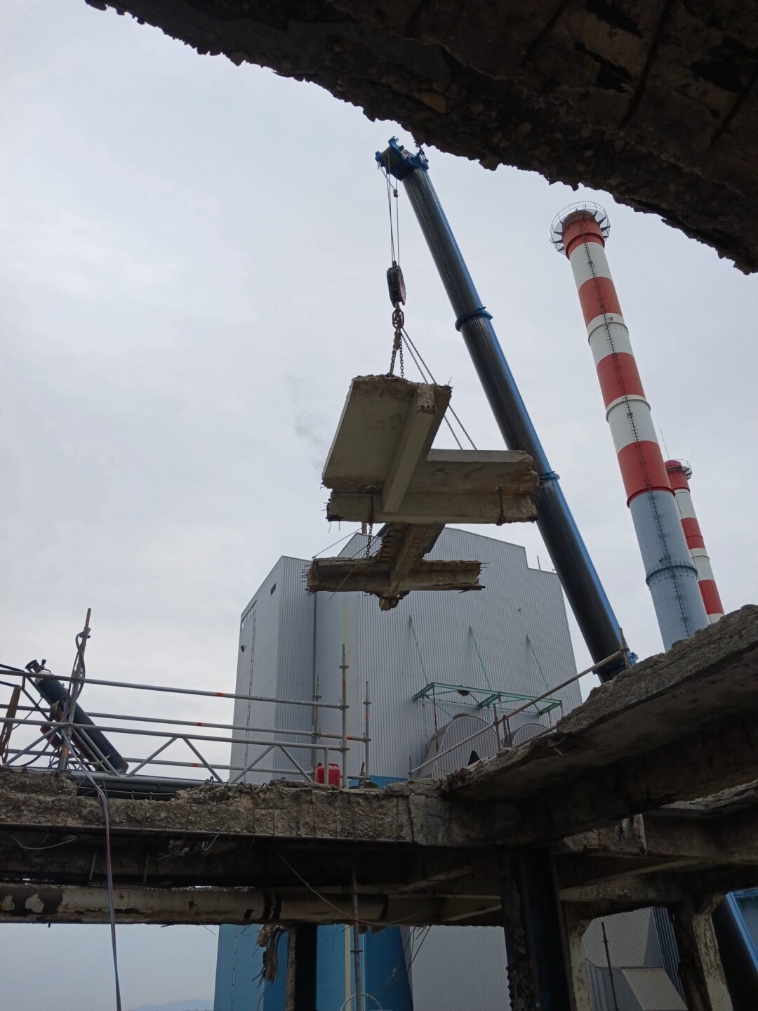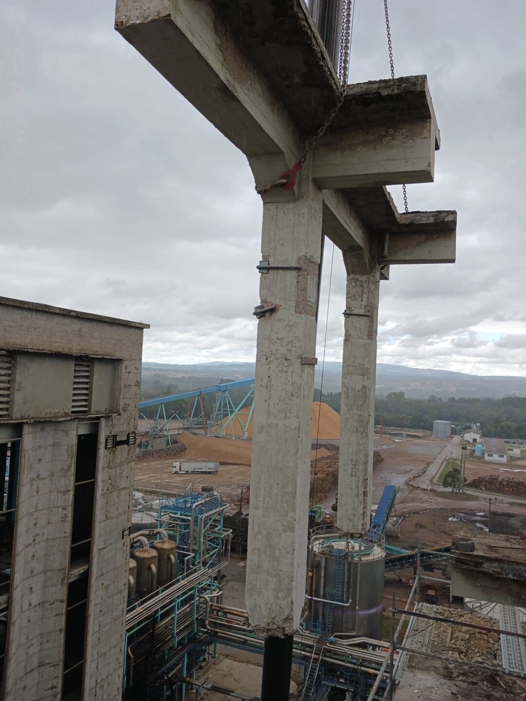 A intervenção consistiu no apoio às operações de demolição controlada de estruturas existentes, incluindo desmontagem de elementos metálicos e em betão armado, corte técnico, fragmentação e remoção de materiais. Foram igualmente assegurados os procedimentos de triagem e encaminhamento de resíduos, em conformidade com as normas ambientais aplicáveis.
