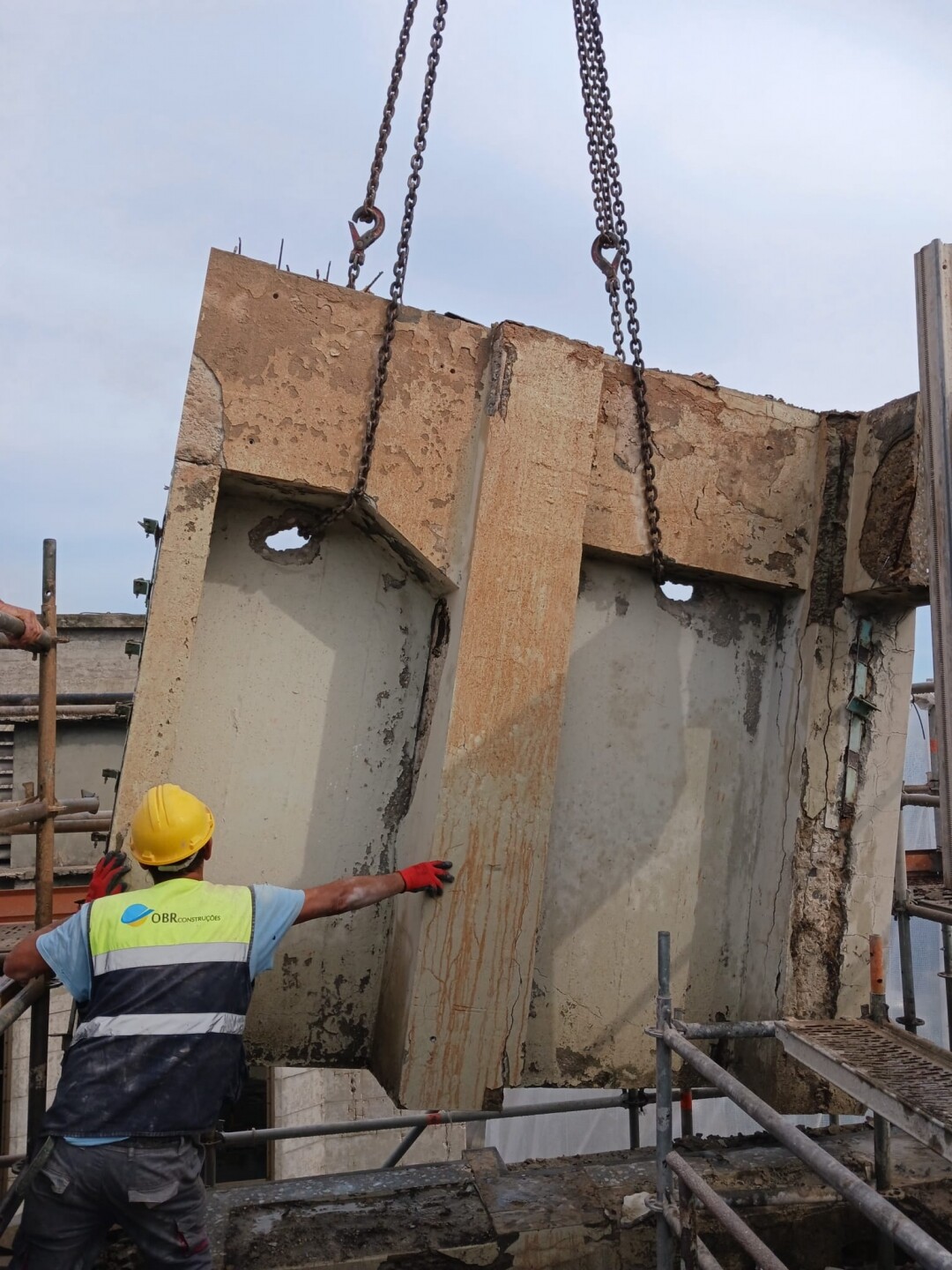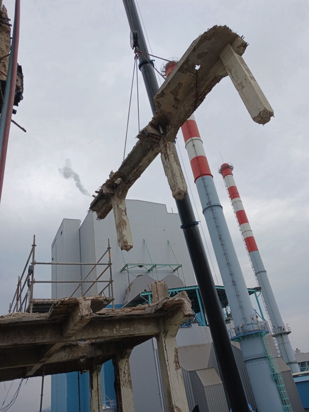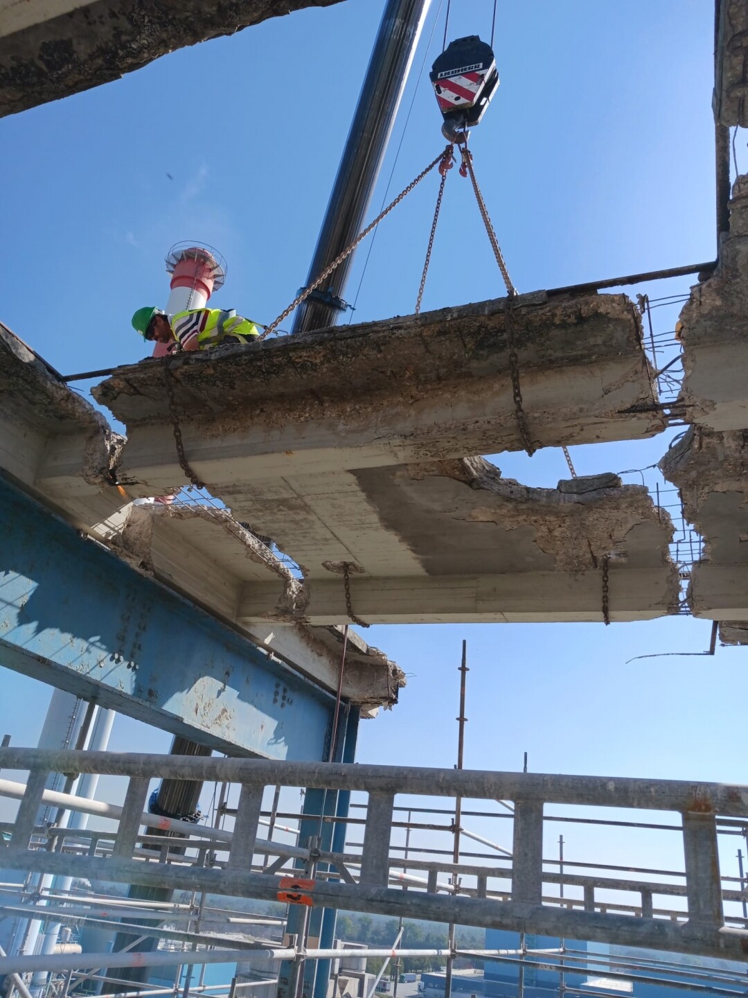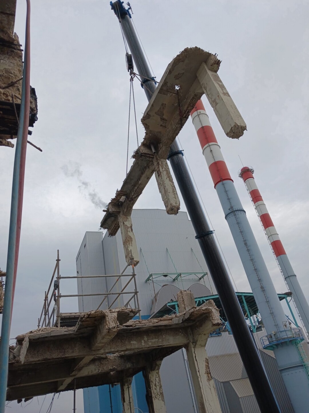 A intervenção consistiu no apoio às operações de demolição controlada de estruturas existentes, incluindo desmontagem de elementos metálicos e em betão armado, corte técnico, fragmentação e remoção de materiais. Foram igualmente assegurados os procedimentos de triagem e encaminhamento de resíduos, em conformidade com as normas ambientais aplicáveis.